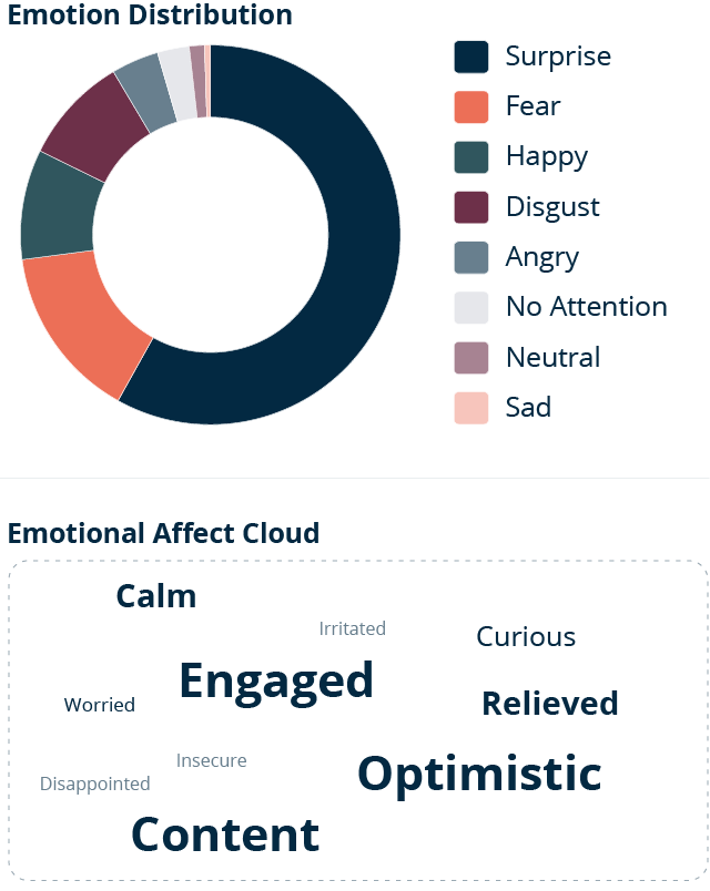 You will then receive a comprehensive report on their performance, which includes intensity timelines, engagement heatmaps, emotion distribution and dominant emotional states.